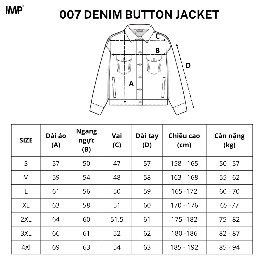 ✨ Áo khoác IMP - 007 Jacket mang đến phong cách trẻ trung, thanh lịch. Chất liệu Denim 13oz (440gsm) gồm 80% cotton, 10% rayon, 10% polyester. Sản phẩm đã xử lý co rút trước, nhưng vẫn co rút 1-2% khi giặt máy.